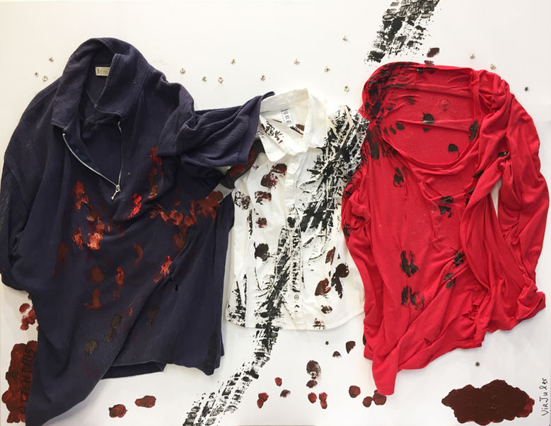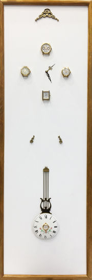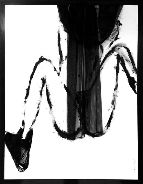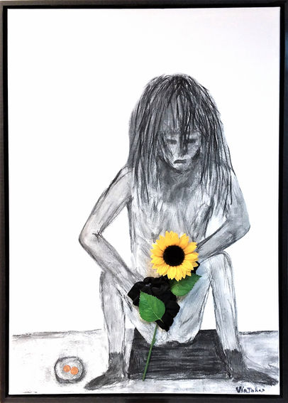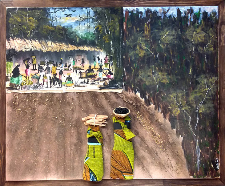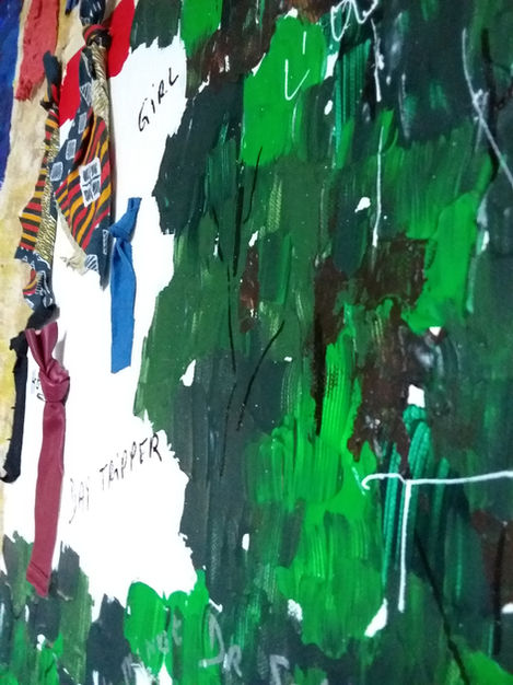 Acrylique, charbon et fixation d'objets sur toile de coton