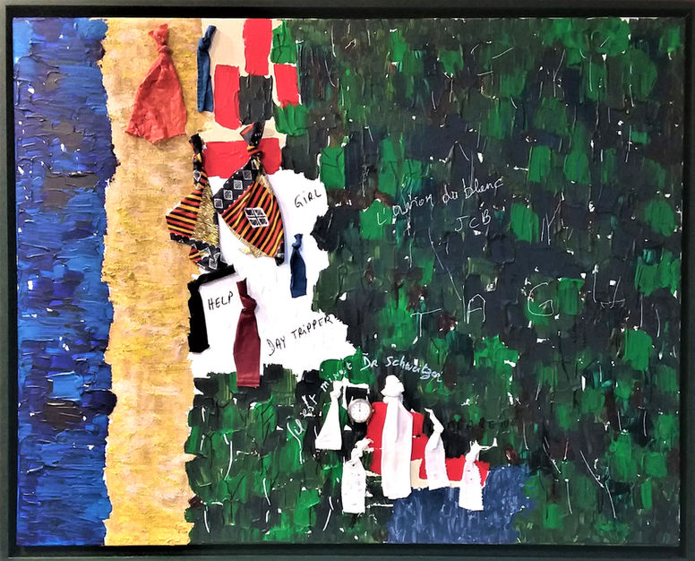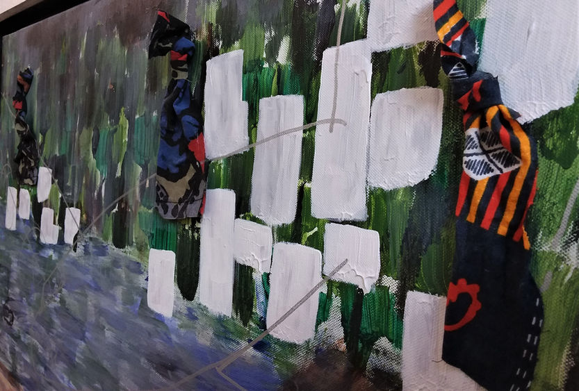 Acrylique et collage papier, tissu et objets sur toile de coton